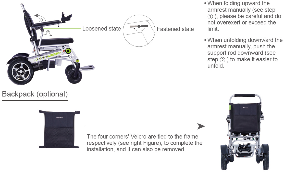 Take out the controller from the accessory box, make sure the main power on the battery box is turned on while the power switch on the controller is not turned on, then press and hold the folding key ① (see Picture3-1) for 3 seconds, release the button when the LED lights are on and there is a beep sound. Press and hold the unfold key ② for 3 seconds to unfold the wheelchair.Press key ③ to stop folding or unfolding.